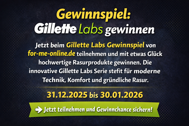 Jetzt beim Gillette Labs Gewinnspiel von for-me-online.de teilnehmen und mit etwas Glück hochwertige Rasurprodukte gewinnen. Die innovative Gillette Labs Serie steht für moderne Technik, Komfort und gründliche Rasur.