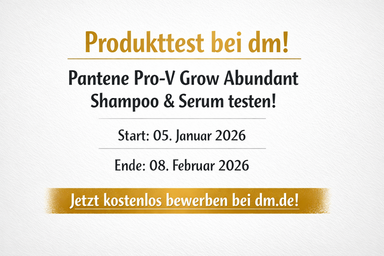 Bei dm.de kannst du jetzt das Grow Abundant Shampoo und Serum von Pantene Pro-V kostenlos testen. Der Produkttest startet am 05.01.2026 und läuft nur bis zum 08.02.2026. Die Pflegeserie verspricht sichtbar kräftigeres, volleres Haar – ideal bei feinem oder strapaziertem Haar.